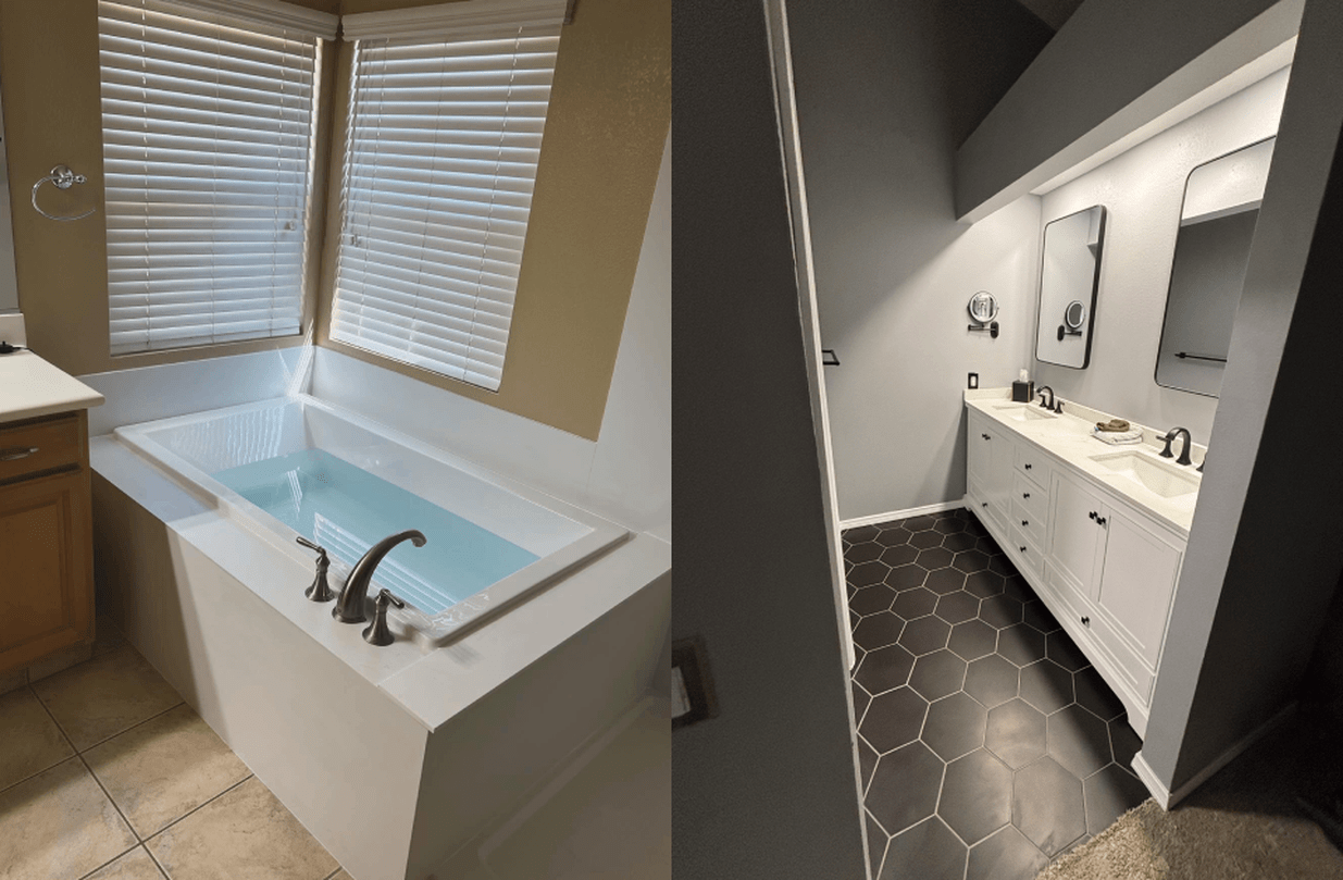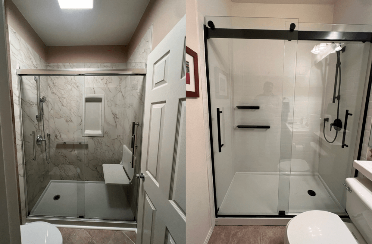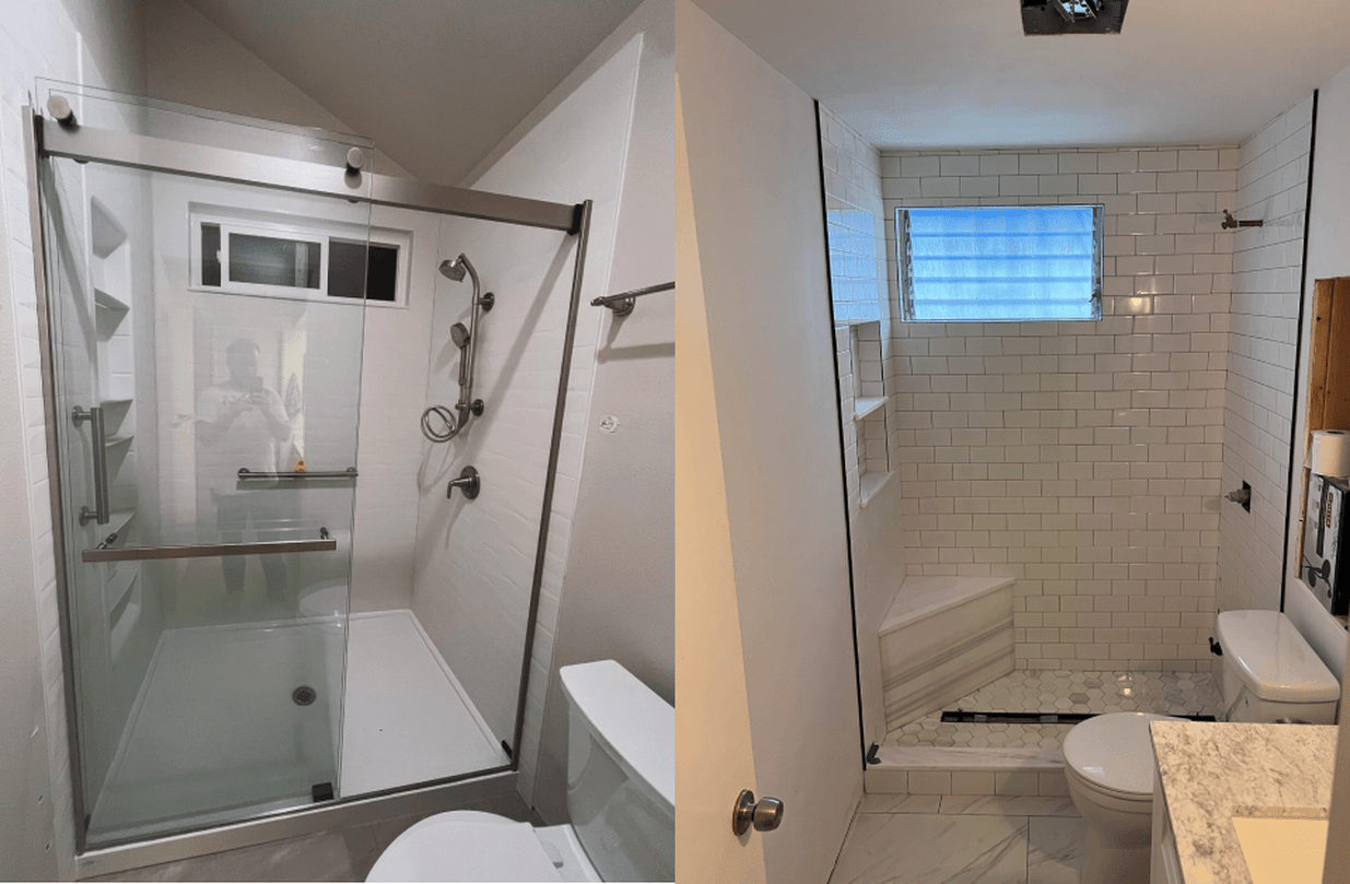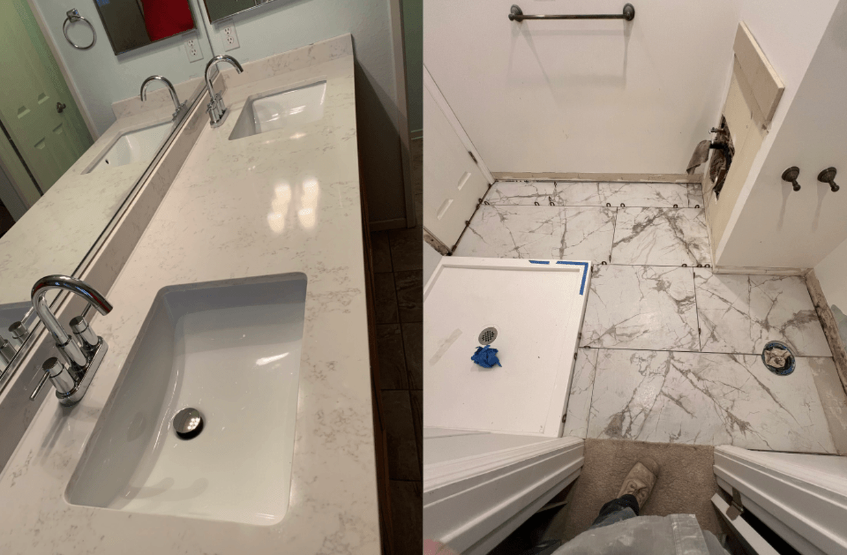 We specialize in full bathroom and kitchen remodels, including walk-in showers, tub-to-shower conversions, vanities, fixtures, tile installation, countertops, cabinets, and backsplashes.